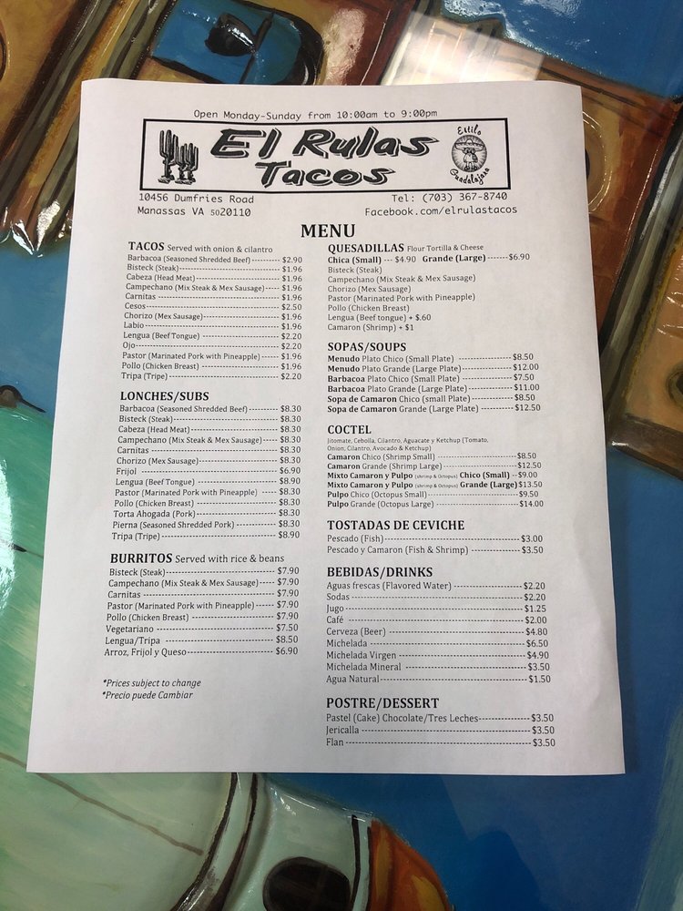 El Rulas Tacos is a Mexican restaurant located in Manassas, VA, offering a variety of delicious tacos and other traditional dishes. With options like Barbacoa, Bisteck, and Pastor tacos, there is something for everyone to enjoy. The menu also includes vegetarian options and happy hour specials, making it a great choice for groups or family outings. Customers have praised the friendly staff and the fresh, flavorful food, with standout items like the Barbacoa tacos receiving high praise. While some dishes like the chorizo and carne asada tacos may be a bit dry, the overall experience at El Rulas Tacos is highly recommended for those looking for authentic Mexican cuisine in a casual setting. Don't miss out on their signature Barbacoa Tacos for a true taste of Mexico.